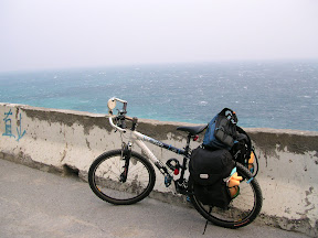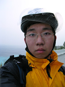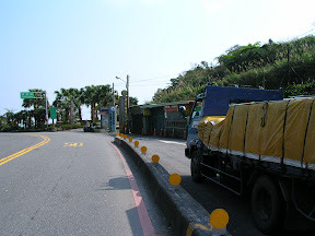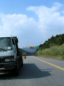 拍完了照一上坡...馬上就看到大尾停在路邊,原來是破胎了,路邊白線附近時常會有碎玻璃or釘子之類的,大尾的胎好像就是被釘子刺破的樣子,然後我就叫起泡先騎我來換胎啦~第一次換不是自己的胎有點不太習慣,不過最後還是在十五分鐘左右把障礙給排除了...接下來又是一路的緩~上~坡~實在是有點落落長,不過還沒有北宜坪林往石牌的那種無盡的感覺,一下子就到了下坡,接下來就一路滑阿滑阿滑~不過就在這個時候我經歷了一個可怕的事情...就是在下坡的時候有一個轉一百八十度的U型彎,原本是可以輕鬆過彎的,不過這個時候一輛砂石車從左邊貼近,對向車道也有來車所以砂石車無處可閃的樣子,就從我身邊大概20公分的地方掠過,又因為是轉彎所以砂石車開得特別慢,而我的話同時要壓車同時也要注意不可以太靠右邊的水溝(水溝邊有一大塊區域都是爛泥阿!!!)過了彎之後砂石車很快的超過我,留下噴得我滿臉的廢氣...不過那個時候我已經開始冒冷汗...開始阿彌陀佛阿彌陀佛的直念了...@@,這是我第一次騎腳踏車騎到有生命威脅的感覺...而在要到東澳的倒數第二個還是第三個彎的路面非常的不好,大尾好像有點打滑的樣子,幸好沒有什麼大礙...到了東澳補了一點水,環顧四周實在是有點荒涼,鎮上沒有什麼人,連商店也是沒幾家,不過往海岸的路有墾丁那邊的感覺,從下坡的時候眺望東澳的沙灘,其實有一股衝動想要跑去那邊玩玩,不過礙於時間.....>O<....只好繼續往前踏囉~