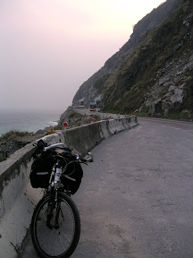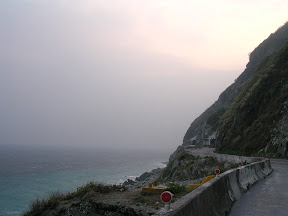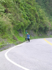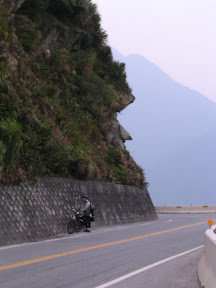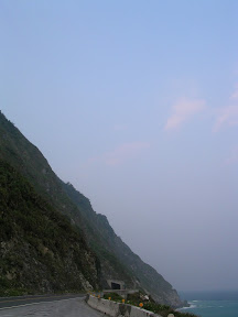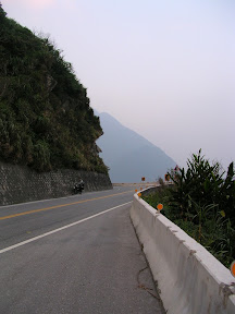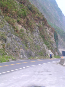 接下來繼續騎就進入了有很多隧道的路段,這時候也學到了訣竅...在沒有燈的路段可以利用前面車子的頭燈掃過路面的瞬間把所有可能造成危險的物品阿坑洞阿什麼的位置大概記起來,接下來就是盡量閃過囉~沿路的風景都還不錯,開始有斷崖之類的景象出現了,所以我也常常停車跑到對向車道的緩衝區去拍照...在大清水隧道的時候我又經歷了一次恐怖的事情...隧道裡面最怕遇到什麼呢?是砂石車嗎?其實還好,因為砂石車只要你不要騎得太靠中間他都會盡量讓你,是什麼呢?是運雞的車子!!!!!尤其是在對向車道!!!他在對向車道還沒有靠近你就可以稍微感覺到前方隧道內的空氣似乎有了令人不祥的改變...一從你旁邊掠過.....我的天阿>O<~~雞屎味加上各種的味道會撲鼻而來,然後這個味道會一直延伸到出隧道為止...重點是還會散落一大堆在空中飄的雞毛....我的天阿~~~應該沒人想要讓那雞毛碰到自己的臉上吧?所以在沒車又沒坑洞的時候我就一直在閃雞毛...@@|||...要進崇德隧道前有一段爬坡,遠看很可怕,但是大概是前一段路大多是下坡跟平路所以就很高速的爬上去囉~
