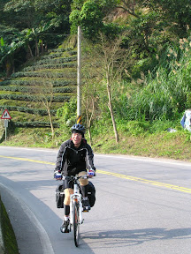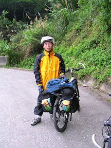 一開始的爬坡都還蠻人性化的,我記得在往石碇的路上一開始我還跟起泡還有大尾說說笑笑,不過快到二格山雲海國小附近的時候開始有了連續爬坡的感覺了,我大概時速都維持在13km/h以上,不過大尾的馬鞍袋好像一直固定不起來,所以有點落後...是小於1.5吋的胎...所以我看到什麼大坑洞阿碎玻璃阿都會用無線電跟在後面起泡先說...就在經過雲海國小之後大尾撥來求救電話...因為馬鞍袋隨著座管式的貨架晃阿晃阿晃,讓他覺得很不安心,所以我就往回爬了一公里左右回去幫忙固定,嘖嘖塑膠繩真是個好用的東西阿~~用來把行李捆一捆就可以減少震動的振幅了...再來就是很順的騎到石碇啦...到了石碇的觀景平台就停下來照了個像,就繼續出發了...