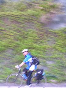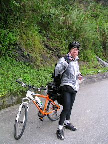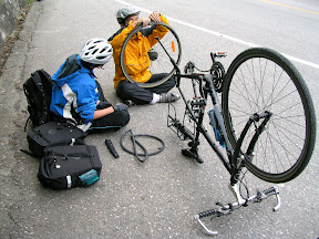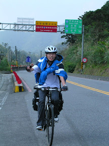 接下來就是往和平的山路了...大致上也沒有什麼大坡度,加上中午的一餐爽度爆表了,所以路就是順順騎阿...開始下滑之後正滑得高興,大尾就說應該要停下來等一下起泡,所以我們就在台九線143公里旁邊的緩衝區等起泡,事後證明大尾是對的...起泡果然打電話來說他在一到兩公里後面爆胎了...原本是要爬回去幫他修,不過起泡說他自己牽過來就可以了,於是在起泡牽車到了之後就開始換胎啦...不過起泡真是太起泡了,因為內胎表面有著很多很多的沙子,應該是已經破了一陣子了,起泡說難怪他在東澳往南澳的山路的時候就有點吃力....起泡神經真是太大條啦~~!!!結論是細胎真的比較難換,除了在挖胎的時候比較困難之外,塞回內胎的時候我也遇到障礙:氣嘴附近的內胎總是會不小心跑出來,後來就打電話給中和的車行老大求救(中和員山路積穗國小旁的富士自行車行~讚喔~),後來就改成先把氣嘴以及周圍的內胎先塞入一些,大尾再用驚人的手力把胎壓打到80 psi左右就暫時排除了障礙,不過這時候風實在很大,所以修的時候全身一直在發抖,上路之後才比較好些...除此之外在修車的同時也遇到了正在清公路路肩的清潔工伯伯,他很訝異現在的變速竟然有24段 27段的...因為就他的記憶好像只有十五十六段左右的樣子...他也開始跟我們抱怨說那些卡車過去都隨手丟東西阿...他掃得很辛苦阿...現代人都沒有公德心阿...挖拉挖拉講了一大堆,聽他說完之後不久我們也修完了,繼續啟程囉~